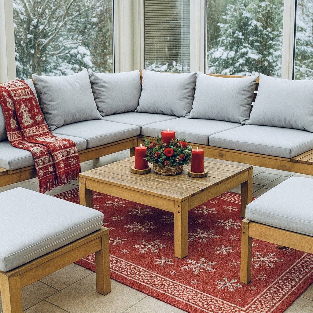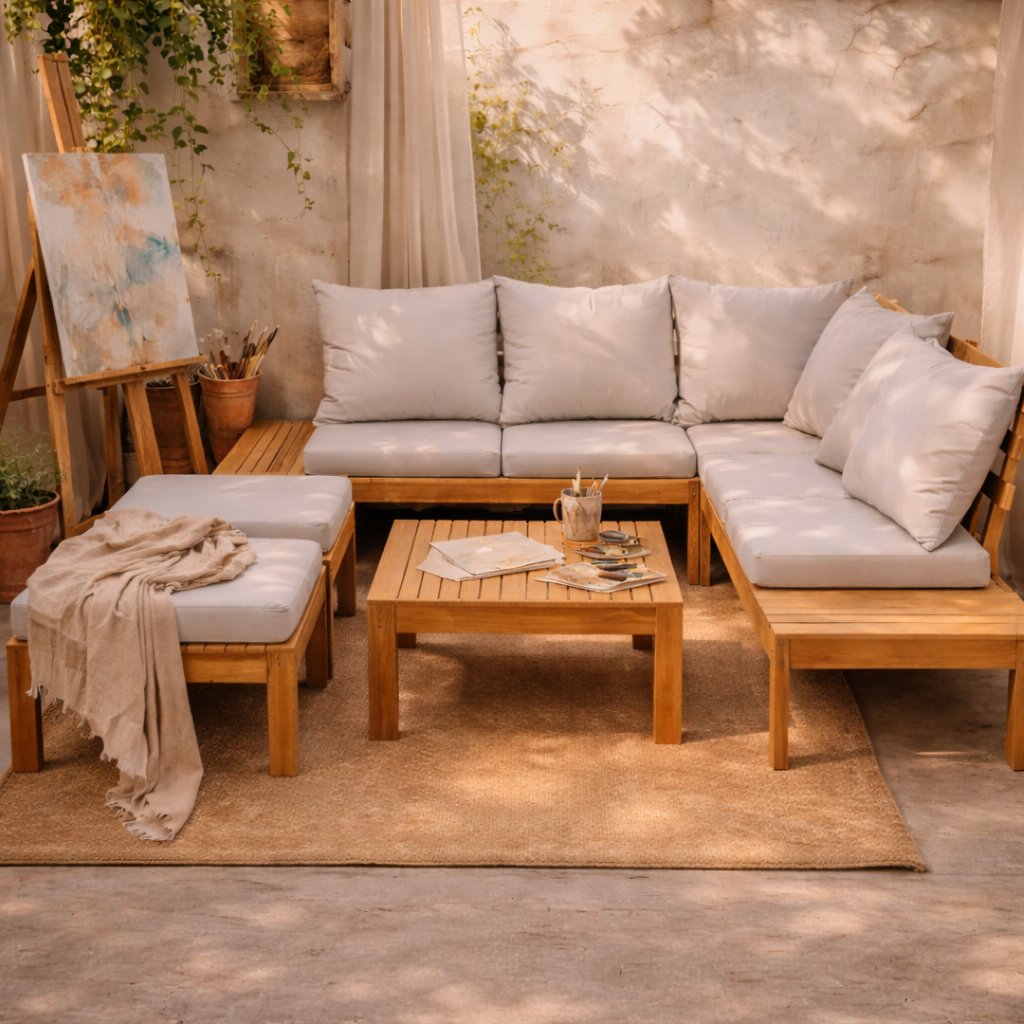 Set je vyrobený z kvalitného dreva, ktorý vyniká svojou pevnosťou a odolnosťou. Rohová sedačka, stolík aj taburetky sú konštruované tak, aby zvládli každodenné používanie a vonkajšie podmienky.