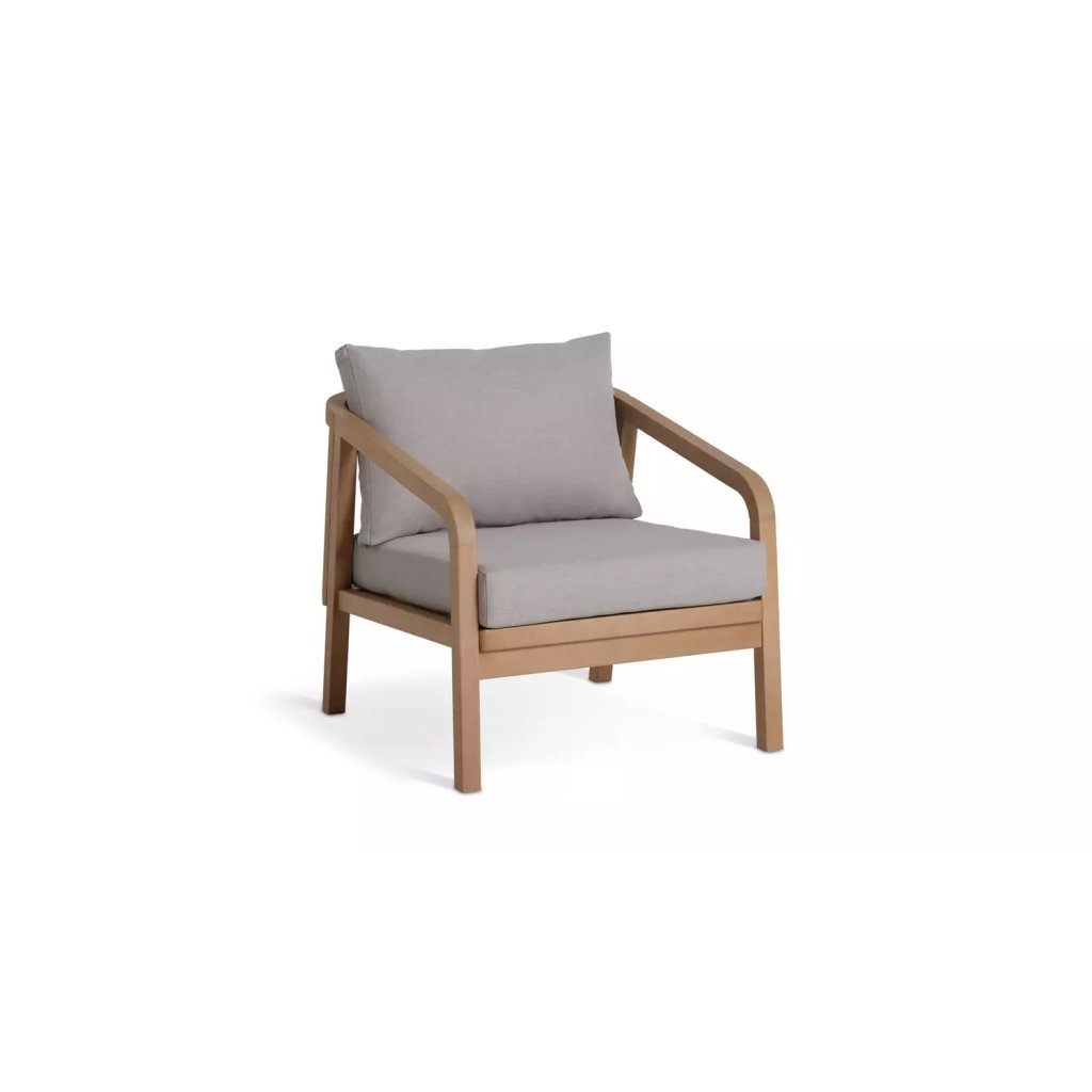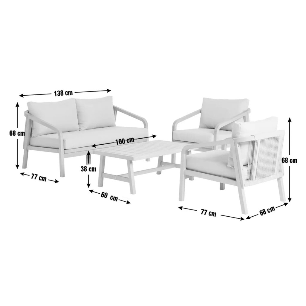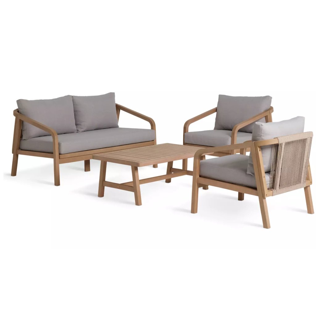 Sedenie Hania pre 4 osoby je vyrobené zo solidného dreva s jemnou teakovou dyhou a prírodnými látkami. Štýlové, jemne zakrivené podrúčky a uhlové nohy dopĺňajú dizajn. Zadné opierky sú definované prepletanou šnúrou, ktorá dotvára prémiový vzhľad, zatiaľ čo mäkké vankúše a sedáky vás pozývajú relaxovať. Set obsahuje 7 vankúšov s odnímateľnými, prateľnými a odolnými poťahmi.