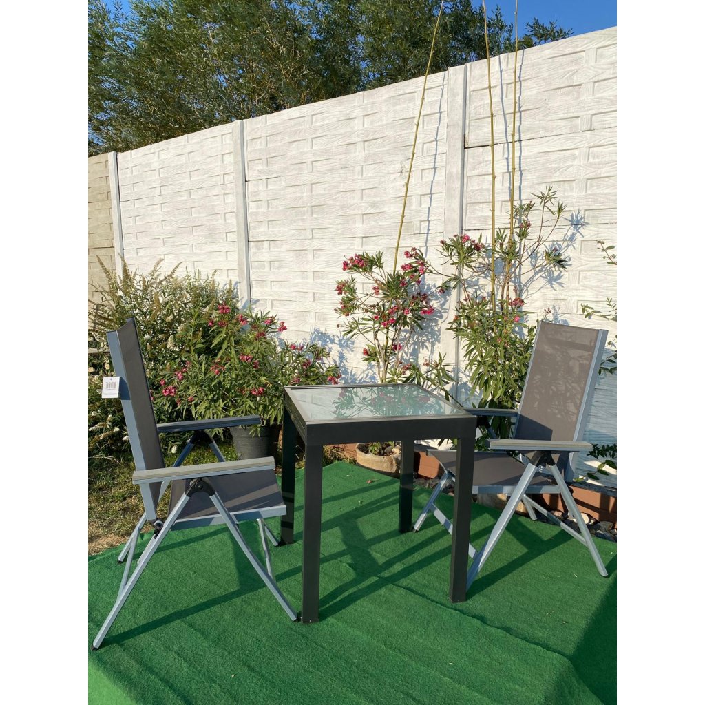 Stôl je vyrobený z hliníkového rámu s práškovou povrchovou úpravou grafitovej farby s vrchnou doskou z matného bezpečnostného skla s hrúbkou 5 mm. Stolička s vysokým operadlom obohatí váš domov o krásny dizajn. Po použití ju môžete jednoducho zložiť a uložiť, aby ste vytvorili priestor na balkóne, či terase. Má hliníkový rám, ktorý pôsobí robustne a poskytuje potrebnú stabilitu. Dá sa sklopiť do 3 polôh. Podrúčka je z materiálu Nonwood (rastlinná biomasa) 5x2 cm. Plastová tkanina na stoličke (70% PVC, 30% Polyester) sa ľahko čistí. Na taburetke je hrubšia tkanina, a vďaka Quick Dry Foam (polstrované sedadlo) nie je potrebný žiadny vankúš. Stoličky a taburetky sú v šedej farbe.