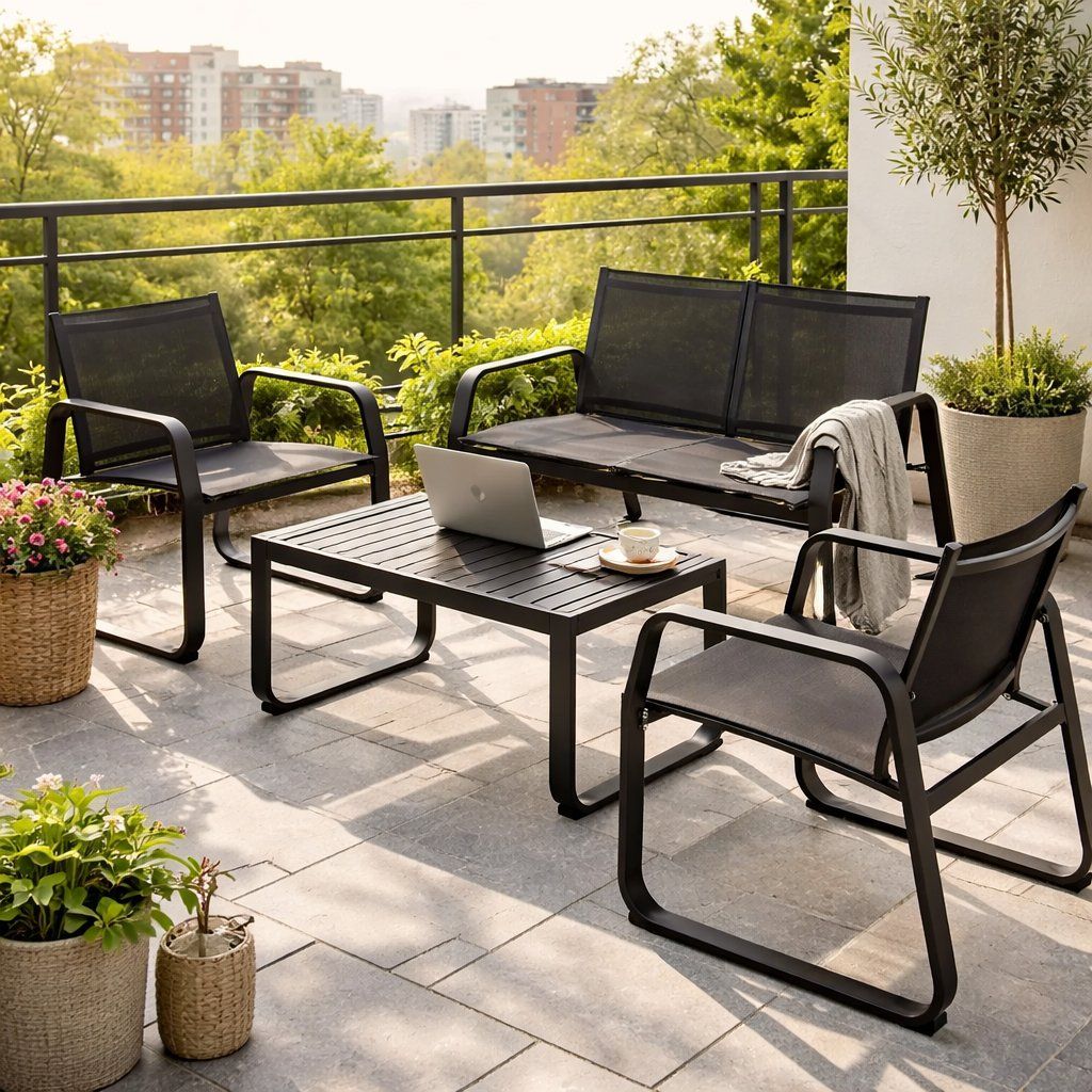 Moderná 4-miestna terasová súprava z čiernej ocele kombinuje elegantný dizajn s praktickým komfortom. Odolné textilénové sedadlá a operadlá poskytujú pohodlie bez údržby, zatiaľ čo lamelový stolík dodáva terase moderný šmrnc. Ľahká konštrukcia umožňuje jednoduché presunutie podľa potreby.