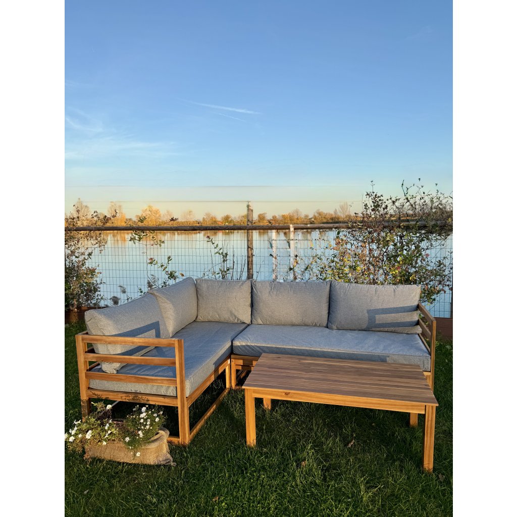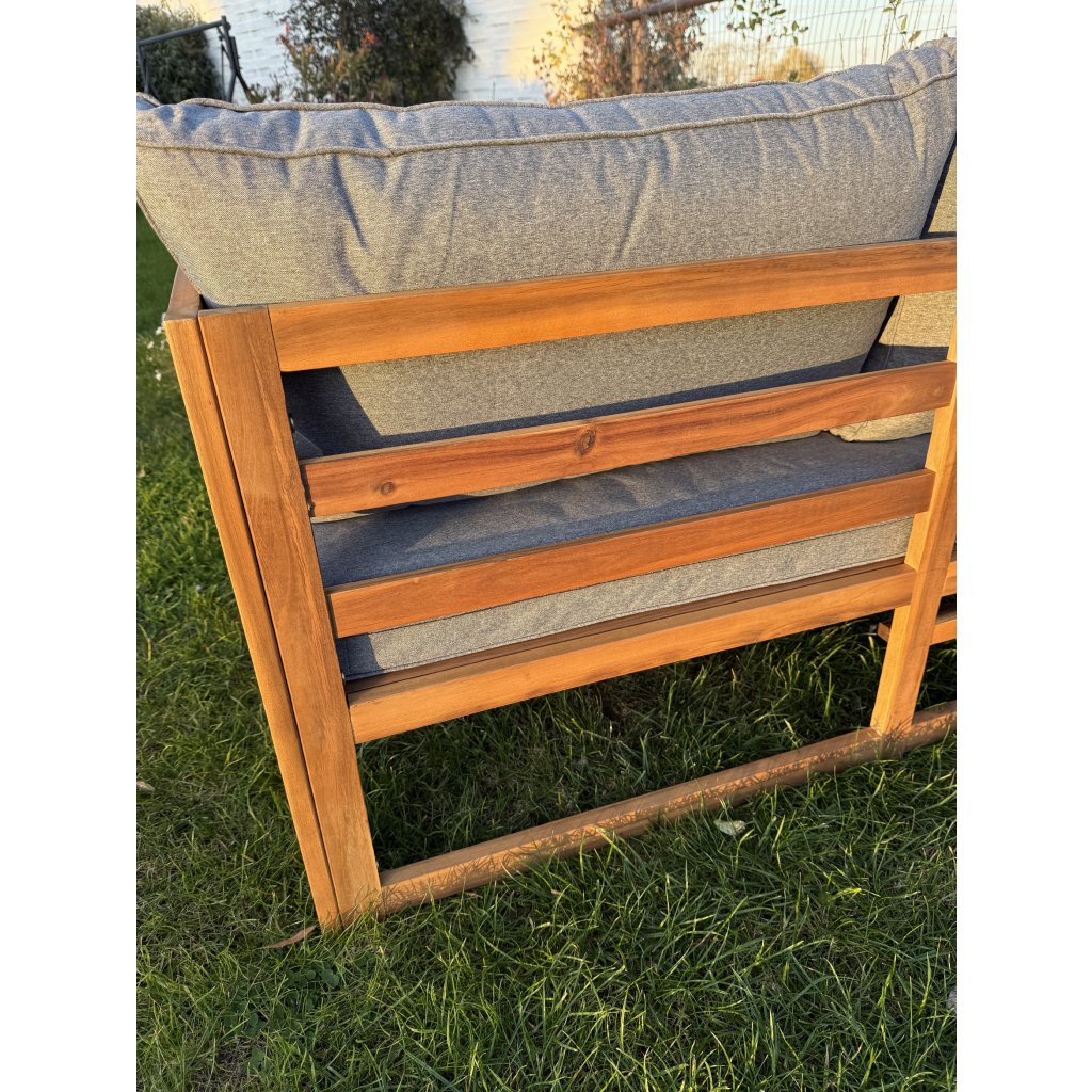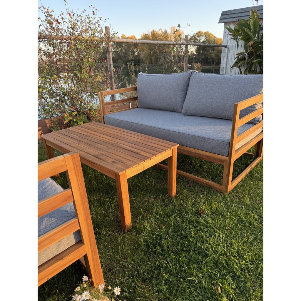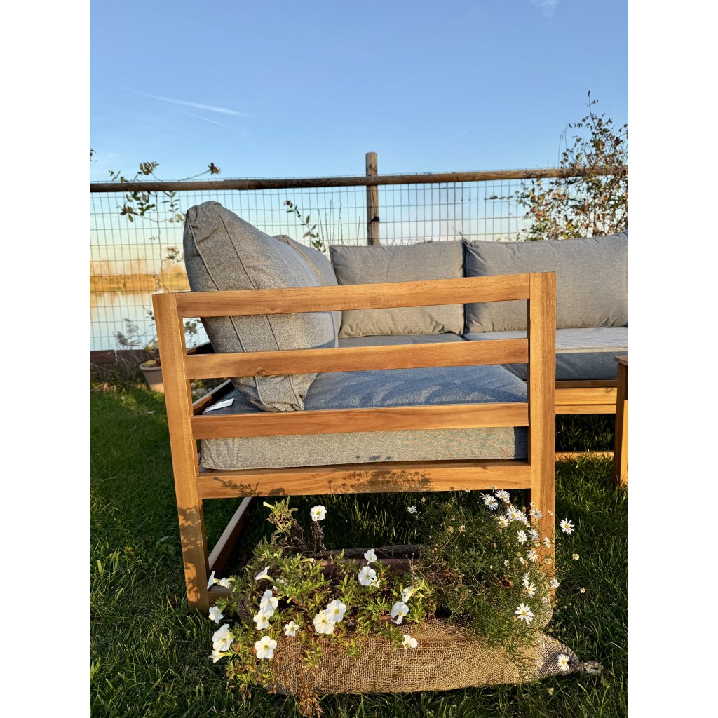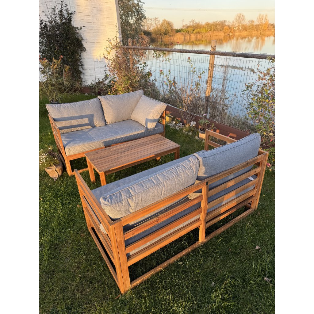 Objavte pohodlie a dizajn v jednom s drevenou záhradnou súpravou Evissa. Vyrobená z bieleného akáciového dreva, ponúka priestranné sedenie pre 4 osôb. Môžete ju usporiadať ako dve samostatné sedačky alebo jednu rohovú zostavu – ideálne pre útulný kútik či elegantnú zónu na relax. Mäkké, pevné sivé vankúše vás pozývajú ponoriť sa do pohodlia, zatiaľ čo stolík v rovnakom dizajne je pripravený na vaše obľúbené nápoje či dekorácie.