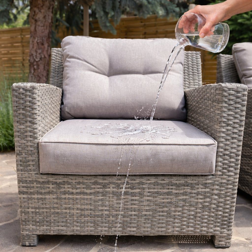 Rám sedenia je zvarený s pevných hlinííkových profilov, čo znamená že vám nebude hrdzavieť a je odolný voči poveternostným vplyvom. Z toho tak isto vyplýva , že montáž je len minimálna. Výplet sedenia je ručne zapletaný dvojitý polyratan šírky 7mm, farba šedočierna, podušky sú hnedé – viď bližšie obrázkoch. Poťah na podsedáku je snímateľný, Poťah na vankúši nie je snímateľný, Podušky sú vodeodpudivé, to znamená že ak sa vám pri oslave podarí niečo vyliať, voda vytvorí na látke kvapôčky., ktoré sa pri poklepaní podsedáka skotúľaju na podlahu..